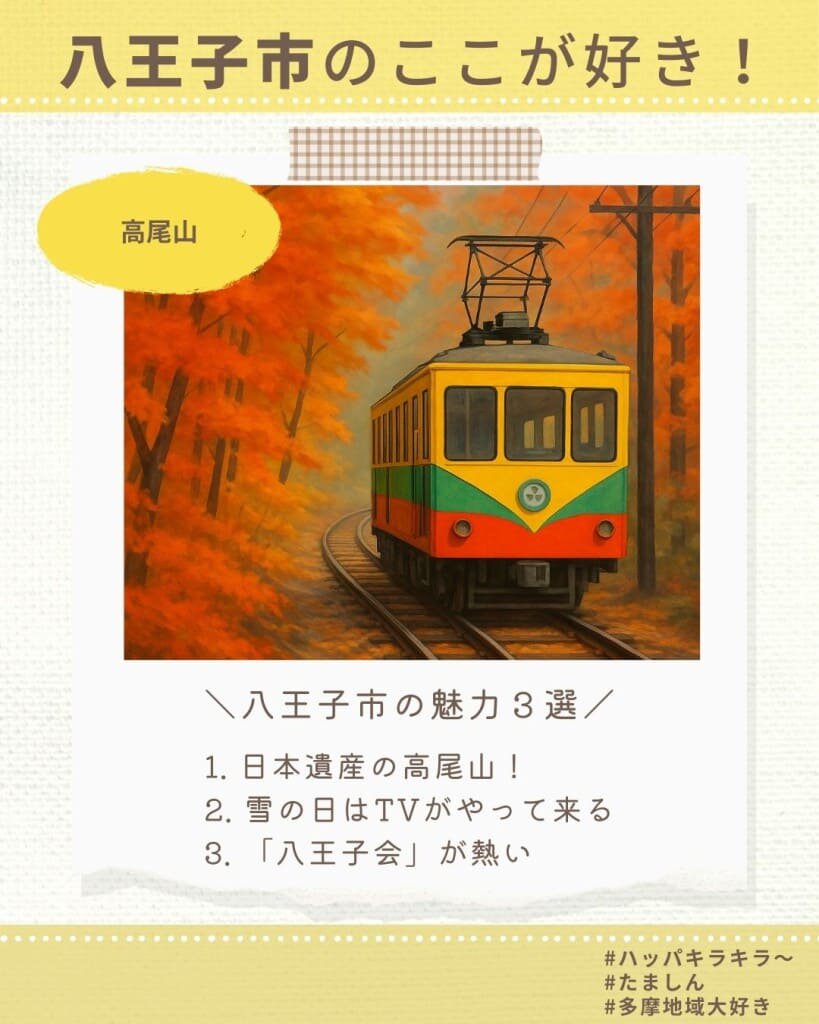 画像は保存して、InstagramやXへの投稿にも使えます。「#多摩地域大好き」のハッシュタグを添えて投稿すれば、同じまちを愛する人たちとのつながりも生まれるかもしれません。